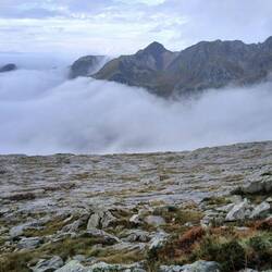 Dieser Teil des Abstiegs kostet mich mehr Zeit als erwartet, da eine steile Felswand mit Sicherungsseilen und teilweise Tritten den Weg prägt. Am Rand des Sees male ich mir aus, wie schön der See bei Sonnenschein sein muss. Der letzte Anstieg mit 500Hm beginnt und ich merke, wie meine Beine schlapp sind. Da hilft es nicht, dass es ich immer wieder in großen Stufen die Felsen hochsteige. Nach über der Hälfte des Anstiegs erreiche ich eine bewirtete Berghütte, in der ich mich in den Vorraum setze und warm einpacke. Meine Beine kommen an ihre Grenzen, was sich auch auf meine Psyche auswirkt. Dennoch möchte ich bis zur nächsten Hütte kommen. Mit kleinen Verschnaufpausen und zitternden Beinen erreiche ich den letzten Pass und blicke auf eine weite Felsplattenlandschaft auf der anderen Seite. Fürs erste sieht es nach einem angenehmen Abstieg aus.