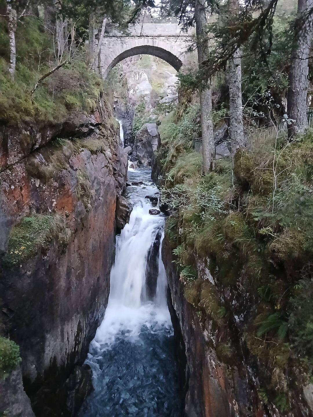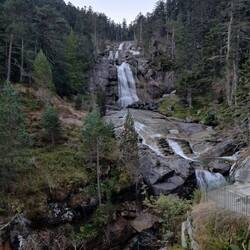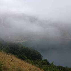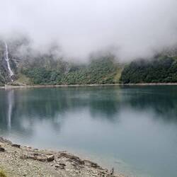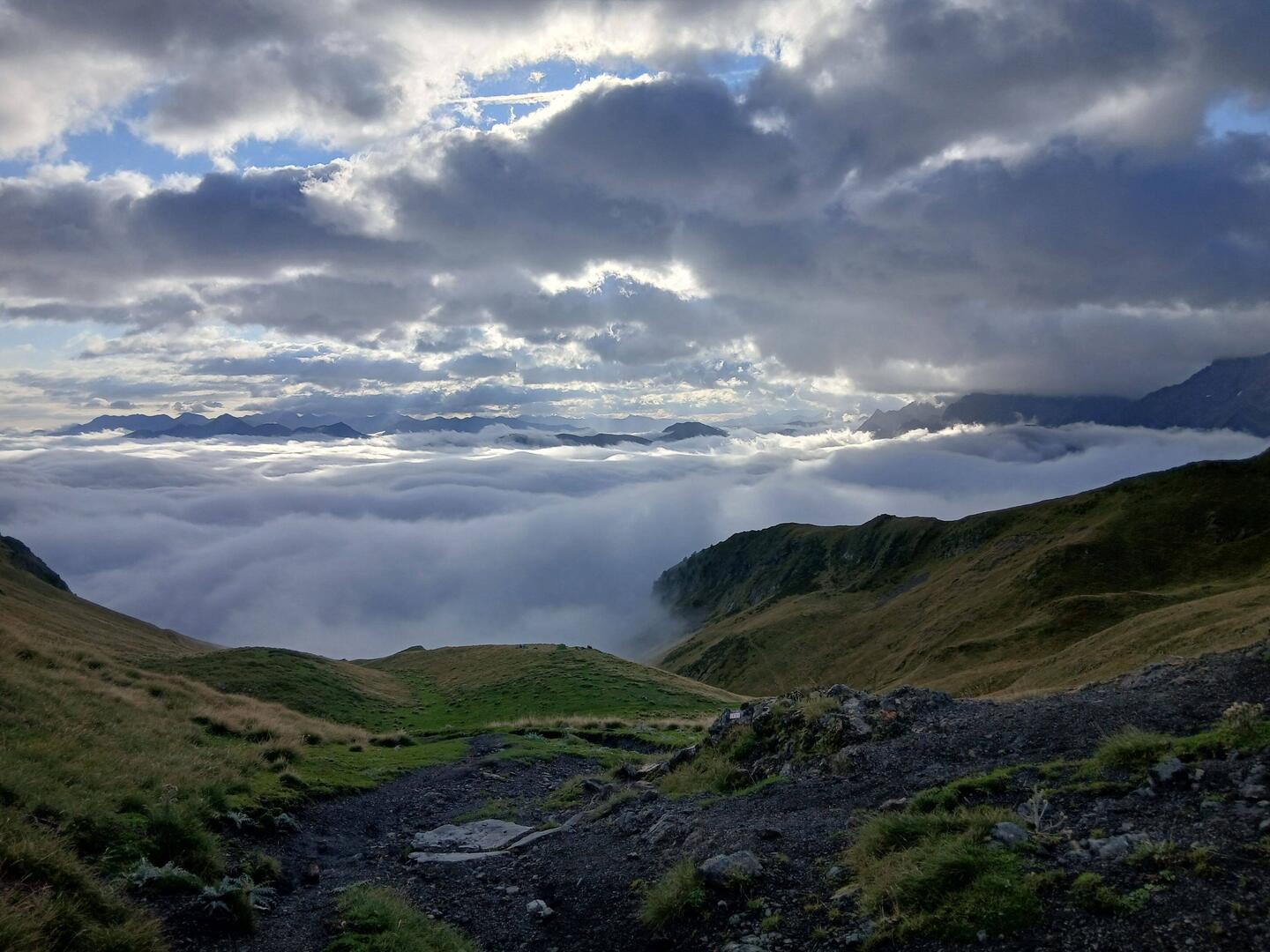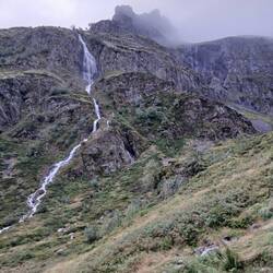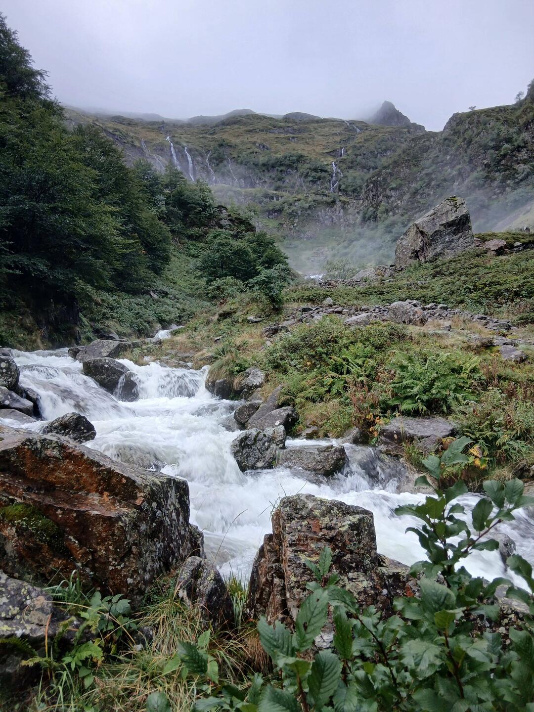 Ich wache in einer Wolke auf und brauche eine Stunde, um mich zu überwinden aus dem Schlafsack zu kommen. Später als angedacht laufe ich nach Superbagnères, um meine Flasche aufzufüllen und dann durch die Wolke dem Berghang zu folgen. Auf dem Pass habe ich eine schöne Sicht zwischen den Wolkenebenen und auch die Sonne erwärmt mir zwischendurch den Rücken. Zu einem See steige ich durch die Wolken ab, wobei sich ein beeindruckender Wasserfall zwischendurch erblicken lässt. Vom See aus führt ein breiter Wanderweg/Bergstraße bis ins Tal, wo ich vor den Füßen anderer Wandernden kleine Plastikschnipsel aufsammle. Keine Reaktion.