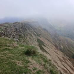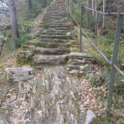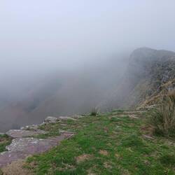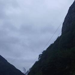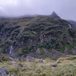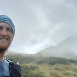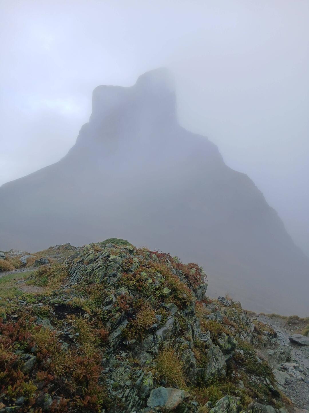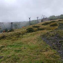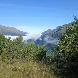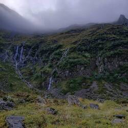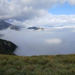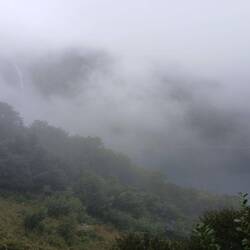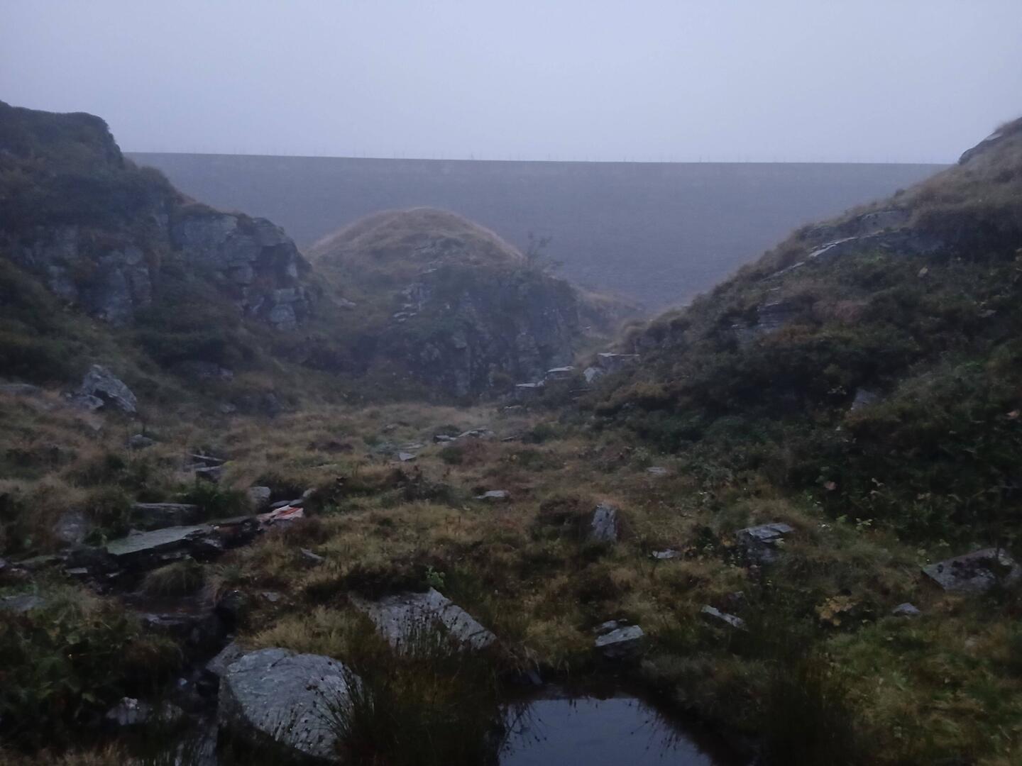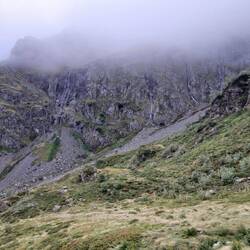 Morgens in der Wolke geht es an der Staumauer vorbei, die mystisch im Berg etwas "Unbekanntes" aufhält. Hoch an der Berghütte vorbei, laufe ich als weiter zum Pass, wobei ich ungewöhnlichen Hunger verspüre und kraftlos Schritt für Schritt setze. Da halte ich es nicht mehr aus und esse einen Müsliriegel mit Erdnussbutter. Schom fühle ich mich besser und steige nach dem Pass ab in die Wolkendecke. In der nächsten Senke bekomme ich Te Araroa Flashbacks, da der Weg fasst durchgehend nass und schlammig ist und ich kaum ausweichen kann. Das Frühstück genieße ich in Mel bei einer Kirche, wo ich mein Handy in einer öffentlichen Toilette laden kann. Ich sehe HT Wanderer, die mir bekannt vorkommen, wobei wir uns nicht unterhalten. Mein Poncho hänge ich derweil zum Trocknen über einen hohen Busch, da es im Wald durch die Wolken doch recht nass war.