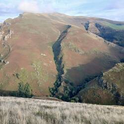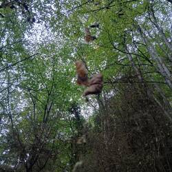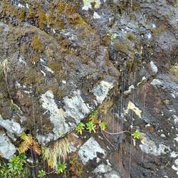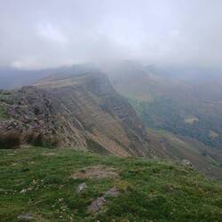 Zwischendurch steigt es bis in die Bäume ab, wo ich ein bisschen die Felswand erkunde. Es folgt ein langer Anstieg bis zum höchsten Punkt der Bergkette, dem Tuturruko Kaskoa (1047m), wo ich mich etwas versteckt auf einen begrasten Felsvorsprung unterhalb der Spitze lege. Eine Weile später, wie drei Männer an der Spitze ankommen, merke ich, dass Anne unbemerkt an mir vorbei gelaufen ist. Ich renne los und sehe sie wenige hundert Meter vor mir die letzte 1000m Spitze zu erreichen. Am Ende des Bergkammes setzen wir uns auf einen Felsvorsprung in der Felswand auf der geschützten Seite und genießen unser Mittagessen. Immer wieder segeln Geier vor uns vorbei und verschwinden dann in den Wolken oder im Berg. Der Rest des Abstieges zieht sich aufgrund des steinigen und felsigen Weges in die Länge und mir ist das Wasser ausgegangen. Am Fluss im Tal stelle ich fest, dass dieser mit ein paar Metern Höhenunterschied sehr schwer zugänglich ist und so hoffe ich auf einen Zufluss 500m weiter.