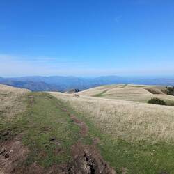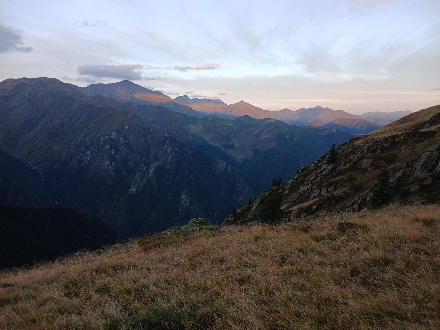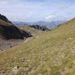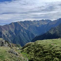 Einen Kilometer nachdem ich weiter laufe, merke ich, dass ich meinen Poncho hängen lassen habe. Also wieder zurück und statt dem HT folge ich dem etwas kürzeren GR10, dem der HT eigentlich folgt. In Fos stehe ich vor einem Regal und überlege mir, wie ich am besten 4,50 € ausgebe. Eine Dose Gemüse, eine Dose grüne Bohnen und ein Croissant. Ich setze mich kurz vor das Kiosk, um die Dosen umzufüllen und das Gewicht der Flüssigkeit zu sparen. Als nächstes geht es mal wieder in vielen Serpentinen auf den nächsten Bergkamm, dem ich mit grandioser Aussicht folge. An der ersten Spitze unterhalb vorbei, wobei ich mich erst darüber aufgeregt habe, dass es da hochgeht, aber die Karte nicht richtig angeschaut habe. Vom nächsten Gipfel genieße kurz die Aussicht, bevor ich den Bergkamm runter renne. Zwischendurch laufe ich durch eine Schafherde, wo ein Herdenschutzhund mich kurz anbellt, aber ansonsten kein Interesse an mir zeigt.