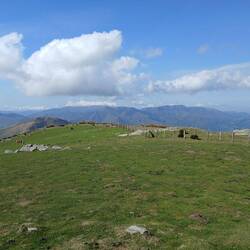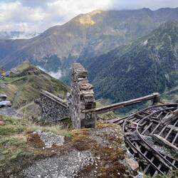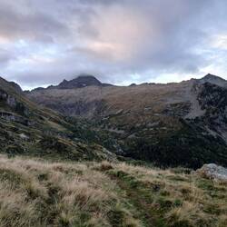 Beim nächsten kleinen Auf und Ab versuche ich ebenfalls ein paar Höhenmeter zu sparen, was aber schief geht und wir aufgrund des Wegverlaufes dennoch den höchsten Punkt passieren. An einer unbewirteten Berghütte genießen wir unser Mittagessen und ich lasse meine Socken und Schuhe trocknen nachdem ich versentlich durch eine getränktes Wiesenstück am Bergbach gelaufen bin. Nach einer ausgiebigen Pause starten wir den letzten längeren Anstieg zu einem Pass, wo ich nach einer Stunde realisiere, dass ich meine Socken hängen lassen habe. Ich ärgere mich kurz, aber da ich sowieso nicht besonders überzeugt von diesen bin, verfällt der Ärger schnell wieder und ich gebe mich erstmal mit einem Paar zufrieden.