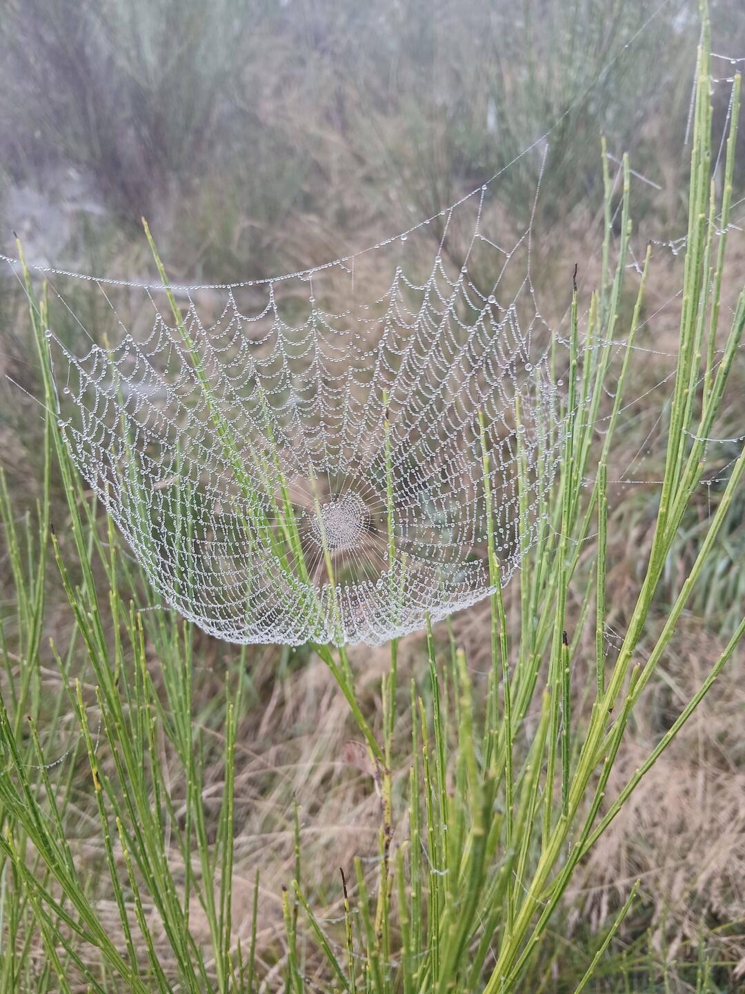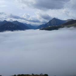 Die ersten Angestellten vom Supermarkt laufen an uns vorbei und lassen uns ungestört liegen. Wie wir zusammenpacken gesellen sie sich zur Kaffeepause zu uns, da wir wohl neben der einzigen Sitzmöglichkeit um den Supermarkt geschlafen haben. Wir erreichen die andere Seite des Wolken bedeckten Tales und genießen zu aller erst ein Croissant mit einer heißen Schokolde in einem kleinen Café. Gestärkt starten wir den ersten Aufstieg, wo ich Brombeeren finde und Spinnennetze im Morgentau glänzen. Ich merke, wie ich kraftlos hinter Anne den Berg erklimme, von wo aus wir zwischen den Wolken spannende Aussichten betrachten und das zweite Frühstück genießen. Da mein Energielevel gering ist, verzichte ich auf unverständliche Schleifen des HTs und nehme eine kürzere Route mit weniger Höhenmeter, die wir sowieso wieder runter laufen würden. Eine Frau begegnet uns, die die Aussicht auf einen See sucht, wobei wir beide nicht wissen, um welchen See es sich handelt.