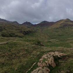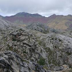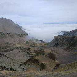 Dieser Teil des Abstiegs kostet mich mehr Zeit als erwartet, da eine steile Felswand mit Sicherungsseilen und teilweise Tritten den Weg prägt. Am Rand des Sees male ich mir aus, wie schön der See bei Sonnenschein sein muss. Der letzte Anstieg mit 500Hm beginnt und ich merke, wie meine Beine schlapp sind. Da hilft es nicht, dass es ich immer wieder in großen Stufen die Felsen hochsteige. Nach über der Hälfte des Anstiegs erreiche ich eine bewirtete Berghütte, in der ich mich in den Vorraum setze und warm einpacke. Meine Beine kommen an ihre Grenzen, was sich auch auf meine Psyche auswirkt. Dennoch möchte ich bis zur nächsten Hütte kommen. Mit kleinen Verschnaufpausen und zitternden Beinen erreiche ich den letzten Pass und blicke auf eine weite Felsplattenlandschaft auf der anderen Seite. Fürs erste sieht es nach einem angenehmen Abstieg aus.
