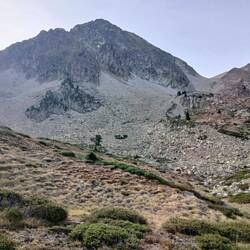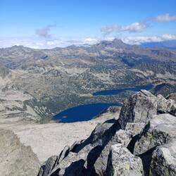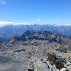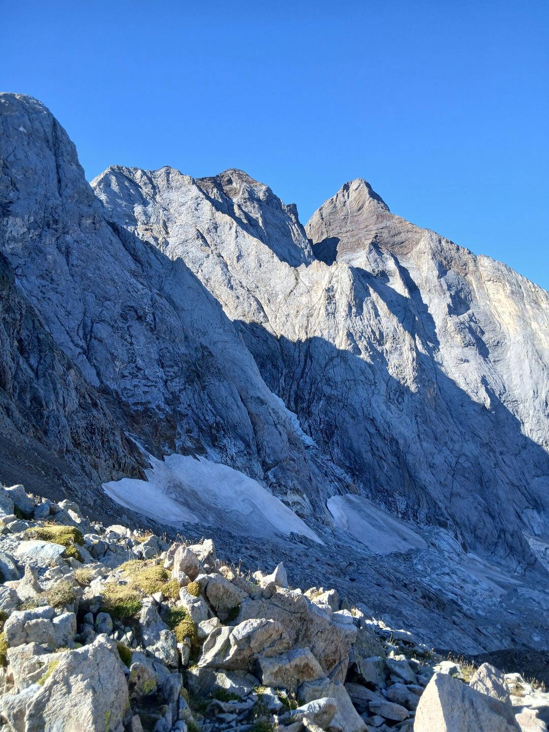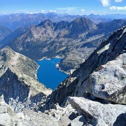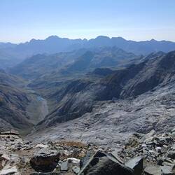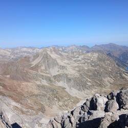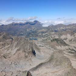 Kurz vor dem Pass trennen sich die Wege und wir lassen unsere Rucksäcke stehen, um einfacher die Pic de Néouvielle zu erklimmen. Kreuz und quer schlängeln wir uns möglichst geradlinig weiter durch das Geröllfeld. Immer wieder beobachte ich, wo andere Wandernde absteigen und versuche mich daran zu orientieren. In 800m steigt es 300Hm an, weshalb sich kleinere Klettereien nicht vermeiden lassen. Über große Felsplatten nähern wir uns der Spitze, bis wir durch einen Kamin oben ankommen. Perfektes Wetter und eine unglaublich schöne Aussicht auf die Hohen Pyrenäen. 4 Wandernde aus Spanien unterhalten sich lautstark, weshalb wir uns zeitnah in den Abstieg begeben. Dem selben Weg zurück zu folgen ist fasst unmöglich und so versuche ich erneut einen Weg erst über die Felsplatten und anschließend durchs Geröllfeld zu finden. Dabei hören wir weiterhin den spanischen Gesprächen zu, die über die gesamte Bergseite ertönen.