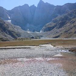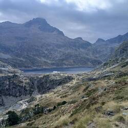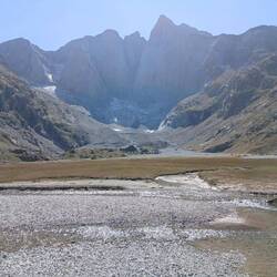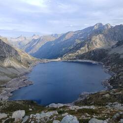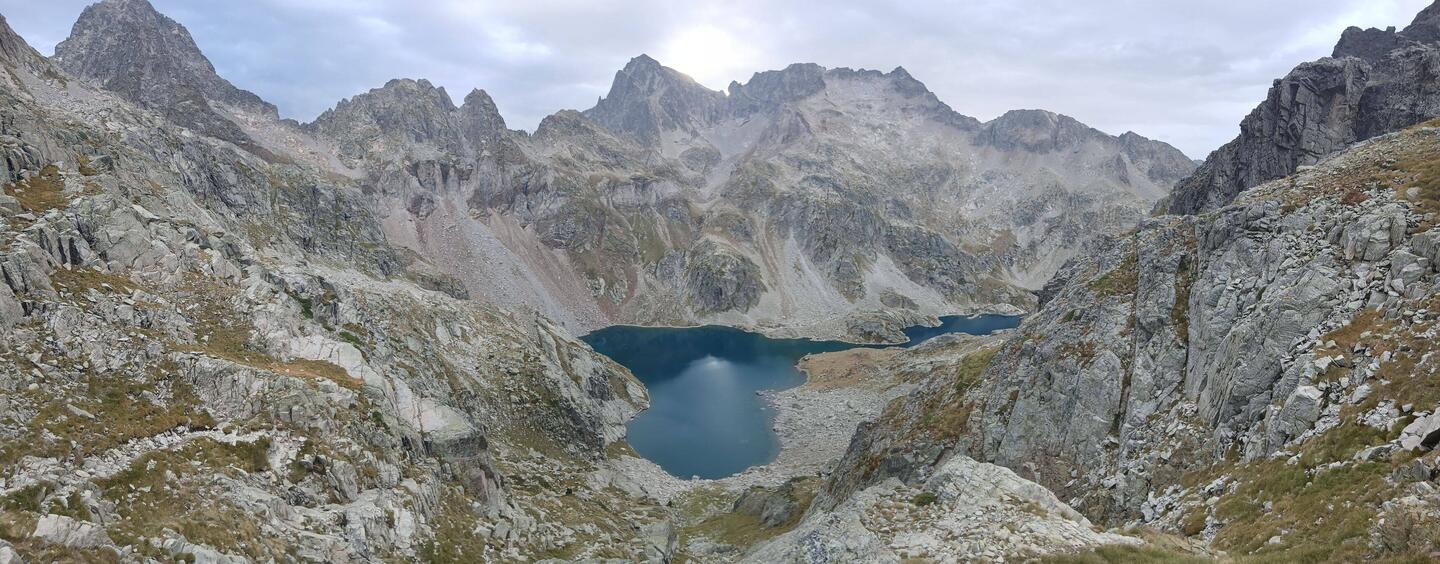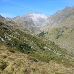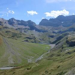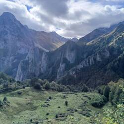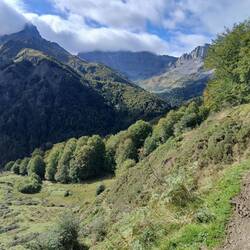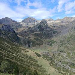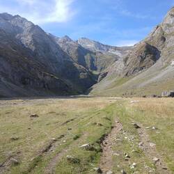 Nach einer doch recht feuchten Nacht durch die Wolken, die tief im Tal hängen, geht es weiter Tal aufwärts nach Gèdre. Dort kaufen wir uns in einem kleinen Laden unser erstes Frühstück, nachdem der Weg mit vielen unerwarteten Steigungen etwas länger gedauert hat. Aus dem Ort steigt es steil den Bergkamm hoch, bis es auf einer Stufe über den Bäumen flacher die Bergseite entlang zu einem Stausee geht. Kurz davor treffe ich eine Frau, die den selben Buff wie ich über ihr Gesicht gezogen hat und ich höre ein Lächeln als Antwort meiner Anmerkung. An einer geeigneten Stelle gehen wir baden und waschen so gut es geht die Kleidung. Nach dem zweiten Frühstück folgen wir dem Tal zum Cirque d'Estaubé, der ein wunderschönes Landschaftsbild hergibt. Leider kann ein Panoramabild dieses kreisförmige Talende nicht so darstellen, wie es auf mich wirkt.
