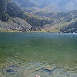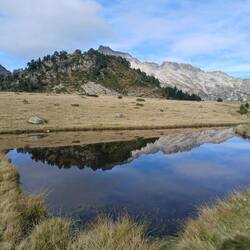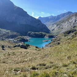 Endlich geht es auf der spanischen Seite ins Tal, wo wir am niedrigsten Punkt mit teilweise Sonnenschein unser Mittagessen genießen. Die ersten Wandernden, die ich auf dieser Seite kurz vorher treffe, sprechen holländisch. Es eröffnet sich uns ein wunderbarer Blick auf die umliegenden Berge, dessen Spitzen aus steilen Felswänden bestehen. Wir steigen bergauf zu einem Bergsee, wo ich von Weitem einige Zelte erblicke und als erstes auf eine Jagdgemeinschaft tippe, da alles tarnfarben aussieht. Wie wir näher kommen stellt sich heraus, dass es wahrscheinlich spanische Gebirgsjäger sind, die neben dem See ihr Lager aufgeschlagen haben. Über diesem zeigt sich ein schönes Naturschauspiel, indem leichter Nebel drüber weht. Ich biege nach dem See in eine andere Richtung ab als Anne, da wir nicht einfach den Wegweisern folgen können. Aufgrund eines Missverständnisses geht sie weiter ihren Weg, bis ich, nachdem ich ein Bild vom See gemacht habe, feststelle, dass sie plötzlich ganz weg ist.