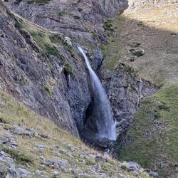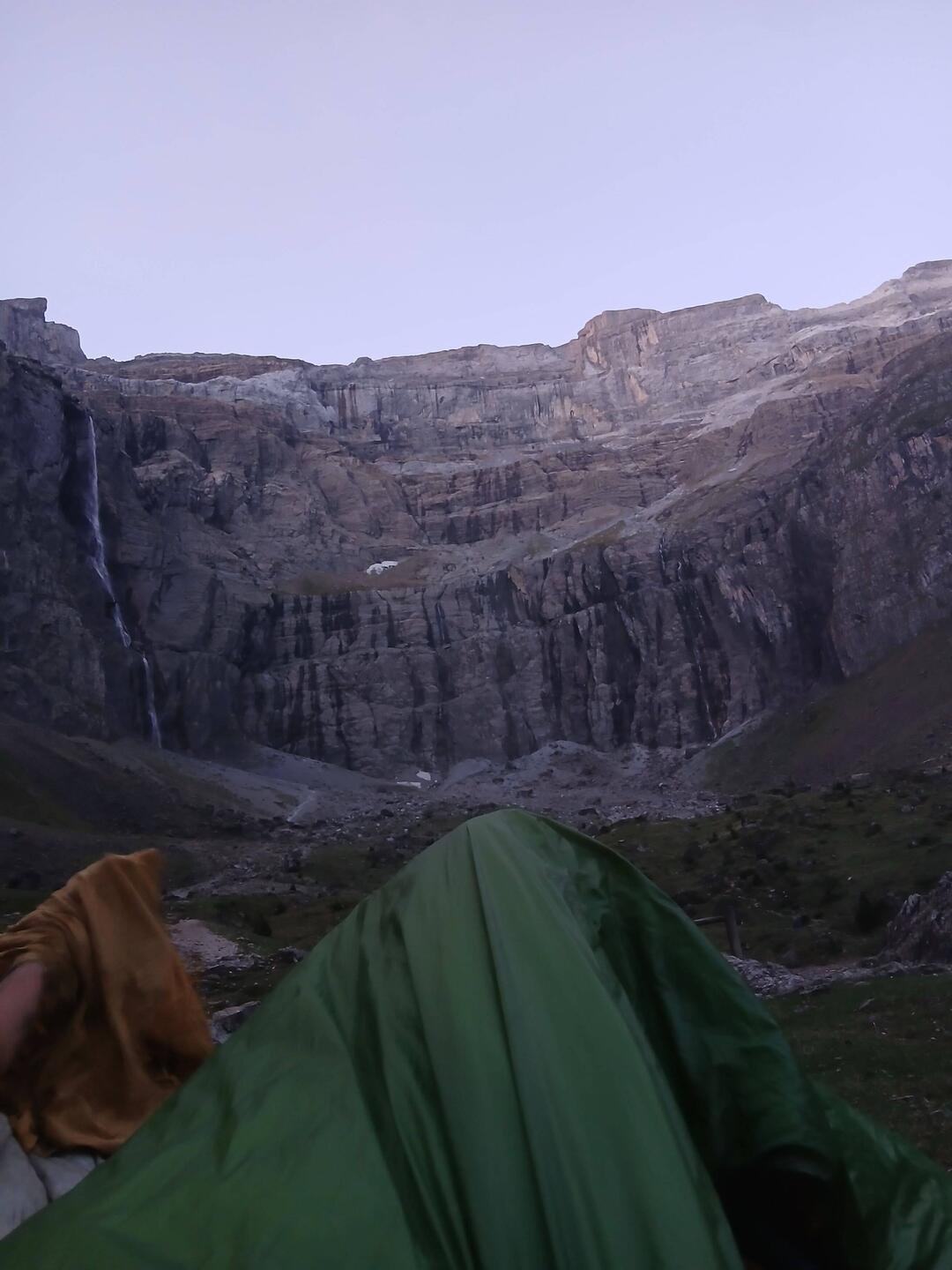 In sanft ansteigenden Serpentinen geht es über einen Pass, von wo aus wir den Cirque d'Estaumé beim Mittagessen bestaunen. Auf der anderen Seite geht es an einer Berghütte vorbei ins Tal, bis wir vom HT auf die Alternativroute wechseln, um uns auf Empfehlung den Cirque de Gavarnie anzuschauen. Der Berghang verwandelt sich in eine steile Felswand, in dessen Mitte unser Weg uns langsam ins Tal führt. Am Eingang befindet sich ein kleines 4 Sterne Hotel, wo Anne nachfrägt, ob wir hier unsere Zelte aufstellen dürfen. Wir werden auf einen Biwakplatz direkt am Talende hingewiesen, an dem wir dann erstmal vorbeilaufen. Hunderte Meter hohe Felswände zu allen Seiten und ein atemberaubender Wasserfall, der über ein Felsvorsprung in zwei Stufen in die Tiefe stürzt. Während Anne das Abendessen zubereitet, schaue ich mir den Wasserfall genauer an. Eine faszinierende aber auch beängstigende Naturgewalt.