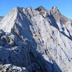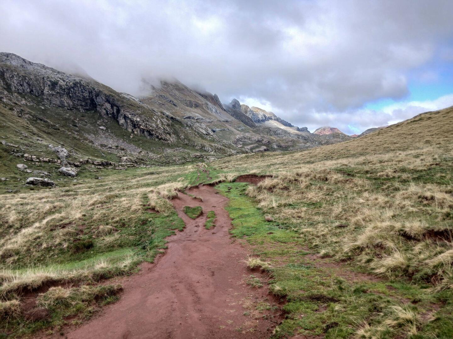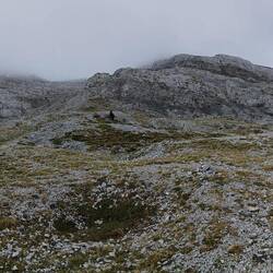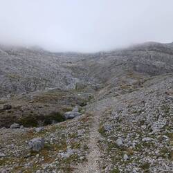 Da es in der Hütte stockduster ist und dementsprechend kein Zeitgefühl besteht, stehen wir so spät auf, dass wir das Frühstück noch in der Hütte zu uns nehmen. Der HT folgt nach der nächsten Hütte ein Stück dem HRP, dr auf Mapy gepunktet, als anspruchsvoll markiert ist. Der Weg führt uns in ein riesige Karstwüste, von Wetter geformte Felsen so weit das Auge reicht. Da wir noch geschwächt sind und die Pic d'Anie in den Wolken liegt, nehmen wir eine kleine Abkürzung. Auch dieser Weg ist gepunktet markiert, was ich nicht nachvollziehen kann, da der Wanderweg fasst durchgehend leicht begehbar ist und selbst die wenigen Stellen mit megr Geröll oder Felsen füe mich als normaler Wanderweg gelten würde.