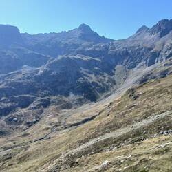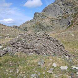Nach einem Stück am See entlang startet der Tag mit einem steilen Anstieg in ein anderes Tal mit mehreren Seen. Auf dem Weg finde ich sowohl Blaubeeren als auch einige Himbeeren auf über 2000m, wobei ich dachte, dass die Beerenzeit schon vorbei ist. Am Lac d'Aubert genießen wir unser Frühstück bevor es auf der anderen Seite der Staumauer stark ansteigt. Einige Wege führen parallel in verschiedener Steigung und Länge den Berg hoch und viele Steinmännchen sorgen für Verwirrung. Eine Zeit lang laufen wir wenige Meter neben dem auf der Karte markierten Weg, bis eine schräge Felsplatte mit einem kleinen Wasserfall uns zurück auf den richtigen Pfad bringt. Nun fängt es immer mehr an im Geröll über größere Felsen anzusteigen, wobei wieder in verschiedensten Richtungen die Steinmännchen zu sehen sind und wir uns immer wieder umentscheiden, wo es besser aussieht.