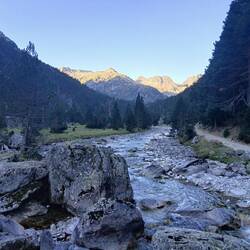 Mit dem ersten Tageslicht packen wir die Zelte zusammen und steigen weiter ab ins Tal. Kurz nach der nächsten Kreuzung finde ich einen Blaubeerstrauch, der in voller Reife steht und ich fleißig Beeren pflücke. Etwas verwundert schaue ich den Weg an, der in einer weiten Schleife ins Tal verläuft, aber der HT in der App anders ins Tal geht. Da die Schleife entspannter aussieht und Anne dieser sowieso auch schon ein gutes Stück gefolgt ist, nehmen wir einen kleinen Umweg. Dieser lohnt sich, da ich sogar auch hier nochmal Himbeeren finde. Bei der Hütte, die das Tagesziel des gestrigem Tages war, genießen wir unser Frühstück und ich wasche meine Hose, die von Flecken aller Art übersäät ist. Eine Ewigkeit folgen wir dem Berghang, bevor der Weg in steilen Serpentinen nach Luz Saint Sauveur absteigt, wo wir am ersten offenen Supermarkt vorbei laufen, um beim zweiten festzustellen, dass dieser Mittagspause hat. Also zurück, wobei wir erstmal nur zur Überbrückung der Zeit Eis gönnen und uns neben einen Waschsalon zum Handy laden setzen.
