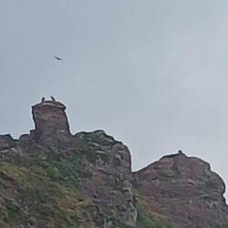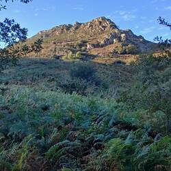 Die ersten Menschen drehen schon ihre Gassirunde, während wir noch im Spielplatzhäusschen liegen. Wir packen zusammen und ich rutsche aus dem Häusschen raus. Am Supermarkt nehmen wir uns die Zeit für unser erstes Frühstück und starten dann auf zum letzten Anstieg über 1000m Höhe. Unweit des Hauptkammes, dem wir eine Weile folgen werden, genießen wir unser zweites Frühstück mit Pferden und Geiern in der Nähe. Kurz vorher sehen wir ein Schild mit einer Zeit- und Entfernungsangabe mit einem Geschwindigkeitsdurchschnitt von 2km/h. Dies würde unseren Tagesplan sprengen und wir hoffen, dass wir weniger Zeit benötigen. Auf der ersten Spitze des Kammes haben wir tolle Aussicht auf Nebel. Während wir dem Kamm folgen öffnet sich immer wieder die Sicht und auch der Atlantik lässt sich an einer Stelle unterhalb der Wolkendecke erblicken.