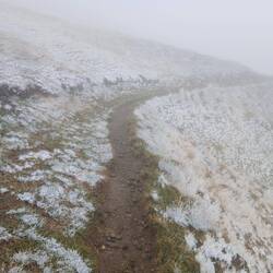 Zu Anne sage ich, dass ich mich nach dem Pinkeln nicht mehr hinlege und gehe raus in eiskaltes Schneewetter. So schnell wie möglich stehe ich wiedee im Winterraum und bereue ein bisschen meine Worte. Dennoch packen wir zusammen und warten ab, ob der Schnee sich ein bischen legt. Zwei Stunden vergehen bis wir mal ein bisschen mehr als nur den Rand vom See direkt an der Hütte sehen. Wir entscheiden uns, zu frühstücken, bevor wir losgehen, da auf dem Weg erstmal kein sinnvoller Halt liegt, wenn das Wetter so bleibt. Mit sehr begrenzter Sicht, aber ohne Schneefall starten wir kurz nach den anderen in die verschneite Landschaft. Die Zehen frieren in den Schuhen schon bald ein und auch die Hände sind kaum warm zu halten. Wir folgen knapp unterhalb dem Bergkamm, während der Wind uns von der Seite gegen den Berg drückt und kleine Schnee- oder Eisflocken uns attackieren.