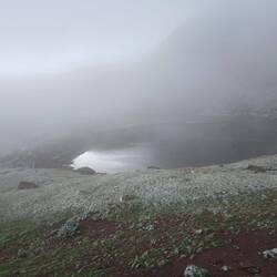 Zum nächsten Pass führt zum Großteil ein ehemals gut ausgebauter Weg. Auch der Abstieg ins Tal verläuft sehr entspannt am Berg entlang und dann in großen Serpentinen. An einer Infotafel hänge ich meine teils noch feuchten Sachen auf und genieße mein Mittagessen, was mal wieder einen Bowist beinhaltet. Der nächste Anstieg folgt anfangs wieder einem Schotterweg und biegt dann aber sehr steil in ein Seitental ab. Auf halber Höhe höre ich Tierlaute, die für mich nach einem Bär klingen, wobei ich lediglich Kühe finde. Kurz vor dem Pass umhüllt mich eine Wolke und die Sicht beschränkt sich auf wenige Meter. Im Abstieg befinde ich mich ineinem Geröllfeld, bis ich einer Wiese zur nächsten Wegkreuzung folge. Der See neben mir versteckt sich in der Wolke und so steige ich direkt zum nächsten See ab.