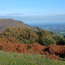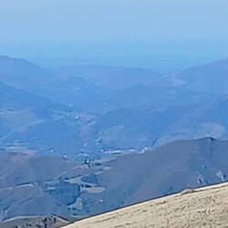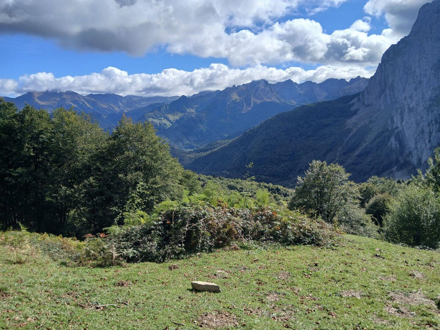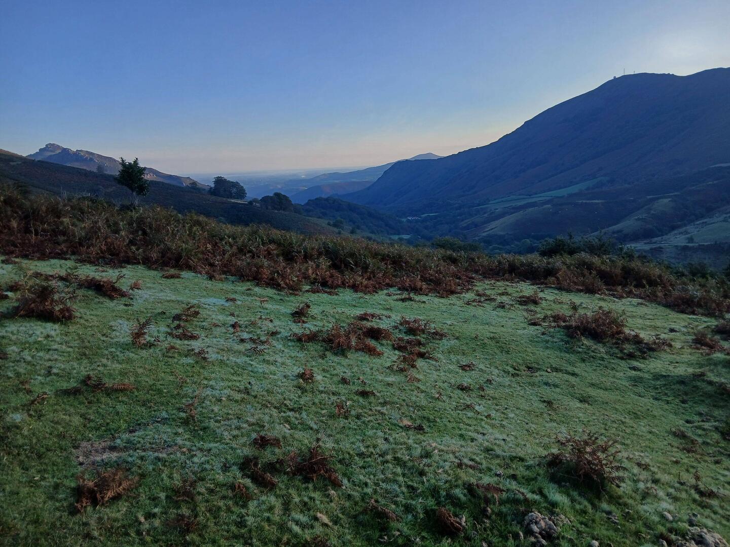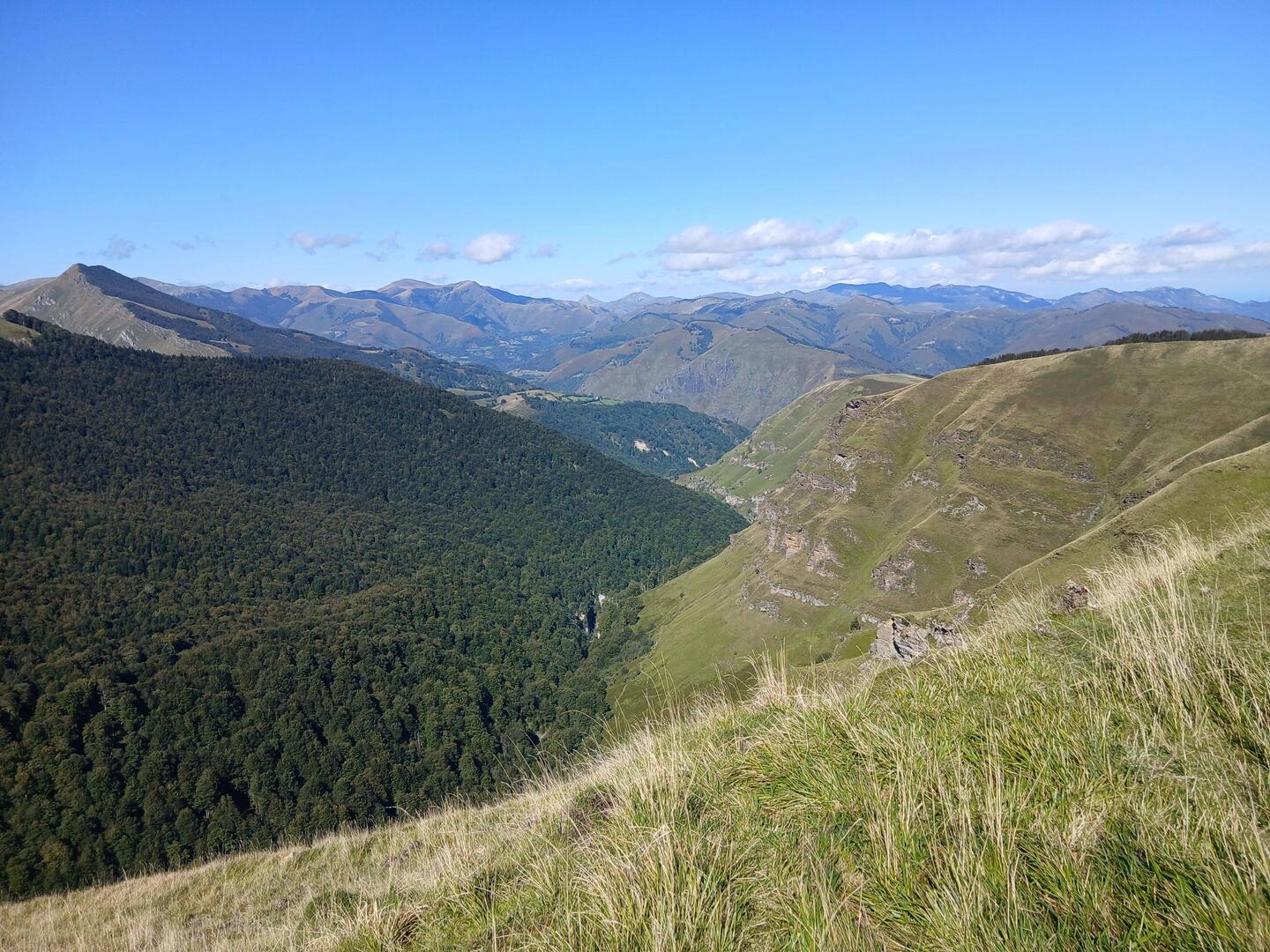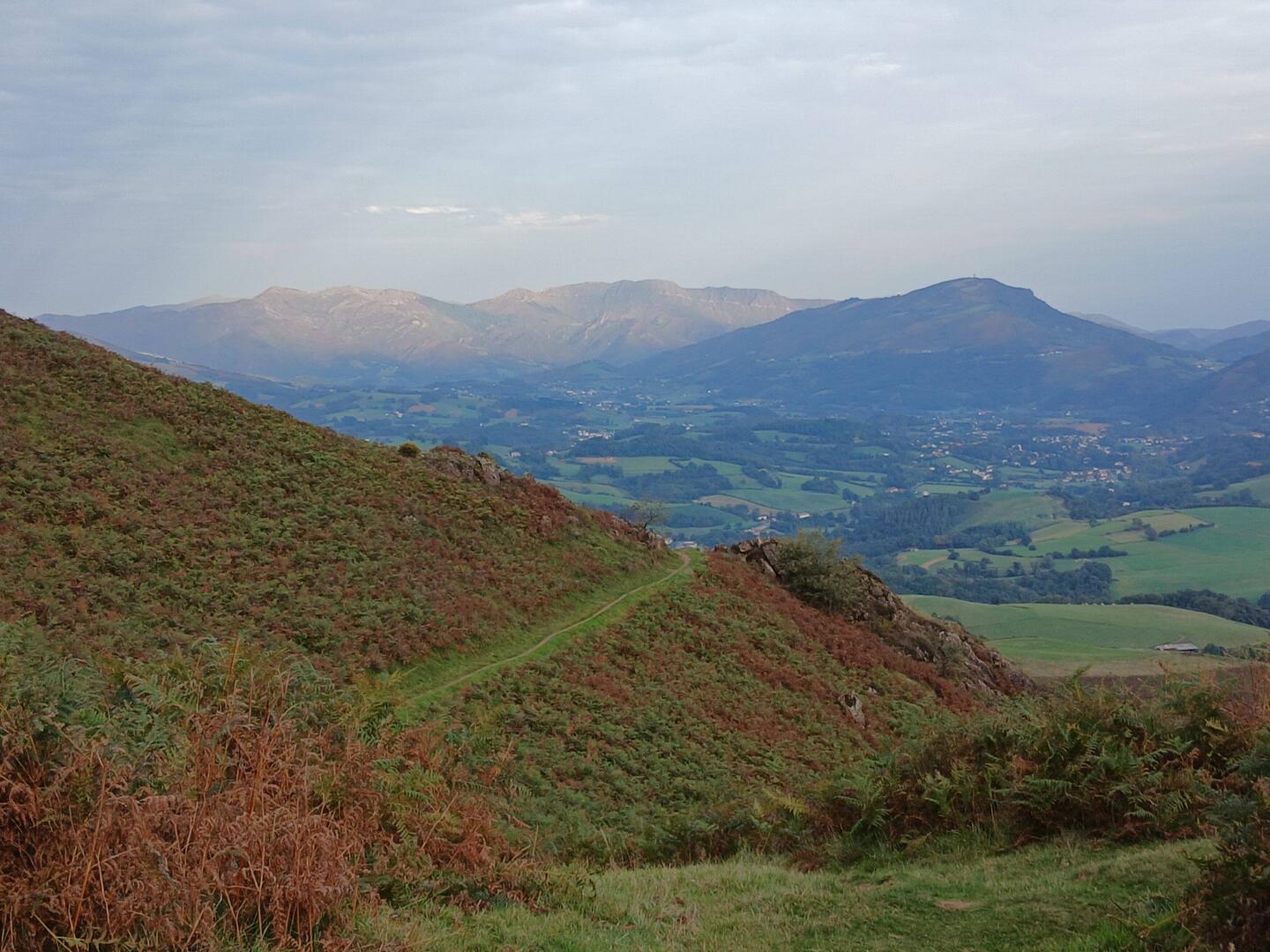 Von oben genießen wir eine schöne Aussicht auf den Rand der Pyrenäen und auch der Atlantik bildet sich teilweise am Horizont ab. Eine weite Wiesenfläche prägt die Spitze und wir suchen uns im Windschatten eines Felsen einen halbwegs gemütlich Platz für zum Mittagessen aus. Am liebsten würde ich einen Mittagsschlaf halten, aber abgesehen davon, dass es mit dem Wind eher ungemütlich ist, haben wir noch einen weiten Weg vor uns. Wir steigen über die steilen Grashänge ins Tal ab und Raubvögel gleiten vor uns durch die Lüfte. Anne hat mir angeboten, bei einem Gasthof auf dem Weg nach einer Banane für mich zu fragen, aber wie wir vorbeilaufen, entscheide ich mich, komplett auf Essen für den restlichen Tag zu verzichten. Damit hoffe ich meinem Magen genug Ruhe und Erholungszeit zu geben und wenigstens die letzten Tage wieder gescheit essen zu können.