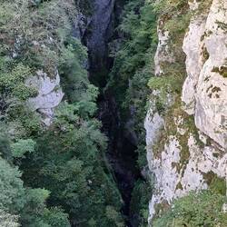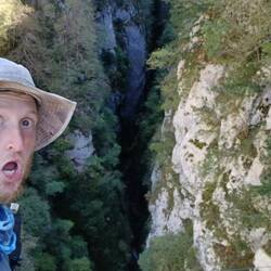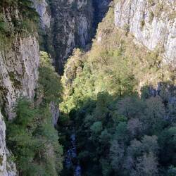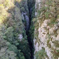 Nach einer ruhigen Nacht, wo der Magen sich nur selten mal mit einem Grummeln gemeldet hat, brechen wir voll eingepackt auf. Zwar steht keine Wolke am Himmel, aber im Tal macht sich die Herbstfrische bemerkbar. Erst nach den ersten Höhenmetern und mit der Sonne ziehen wir uns leichter an. An der ersten Berghütte setzen wir uns vornedran und genießen unser Frühstück. Auf den letzten Metern bis zum Pass übersetze ich ein paar Worte in die baskische Sprache, da wir Gestern bei dem Restaurant die Gastwirtin und ihren Mann baskisch sprechen gehört haben und es sehr fremd klang. So heißt Hallo-Kaixo (Kaisho), Guten Tag-Egun on und Dankeschön-Eskerrik Asko. Nach ein paar Wiederholungen versuche ich andere Wandernde auf baskisch zu begrüßen. Derweil laufen wir vom Bergkamm weit in eine Schlucht in einer riesen S-Kurve, wo ein Mann mir mit Egun on antwortet und Anne damit etwas überrascht. Wir kommen an eine größere Hängebrücke, die über die 150m tiefe Schlucht gespannt ist. Ich frage mich, wie viele Jahre pro Sekunde in einem Zeitraffer vergehen müssten, wie das Wasser sich langsam Meter für Meter in den Felsen gräbt.