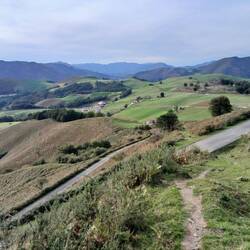 Um 7 Uhr weckt uns die Kirchturmglocke mit einem Sturmläuten. Das scheint hier üblich zu sein, dass um 22 und um 7 Uhr die Glocken 10 oder 20mal schnell zum Nachtbeginn und -ende geläutet werden. Im Dunkeln packen wir unsere Rucksäcke und starten mit einem einstündigen Anstieg. Oben ein kurzes Stück flach, bevor es wieder ins Tal geht und die Sonne zwischen den Wolken hindurch die Bergkette in der Ferne anstrahlt. Über kleine Hügel und Täler geht es nach St. Jean Pied de Port, wo wir zuerst zum Supermarkt laufen und uns für den Tag versorgen. Für mich gibt es nach knapp 20h wieder die erste Mahlzeit und ich versuche mich nicht zu übernehmen, während wir auf einer kleinen Rasenfläche den Einkauf umpacken.