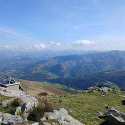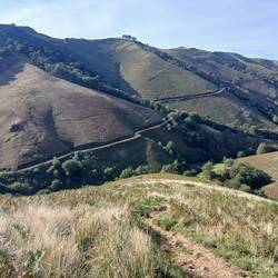 Mein Magen meldet sich wieder und hält mich die halbe Nacht wach. Morgens wache ich mit schmerzendem Bauch auf und versuche mich im Zelt erstmal hinzusetzen. Ich hab mich wohl zu früh gefreut und gestern zu viel gegessen, weshalb ich nun die Retourkutsche bekomme. Im Dunkeln packen wir zusammen und starten mit dem ersten Tageslicht. Der erste Mann, dem ich begegne, frägt mich, ob bei einer Schafsherde hinter mir ein Herdenschutzhund dabei ist, da diese hinter uns herkommt, wobei ich keinen Hund gesehen habe. Der Weg bringt uns an die spanische Grenze vorbei an einem Bauernhof, wo ein Pfau sich durch seine Laute bemerkbar macht. Der Gockelhahn und auch die Hunde stimmen mit ein und geben uns ein tierisches Konzert. Im folgenden Stück überraschen mich immer wieder Ponys, die sich im hohen Gebüsch im Hang aufhalten. Die hier im baskenland typischen Pottok-Ponys sind entsprechend klein und dürfen in begrenzten Bereichen auf den Bergen frei umher laufen. Nach dem nächsten Sattel geht es einen Bergkamm runter, wo ich an einer Hütte Wasser auffülle und wir bei der nächsten Hütte frühstücken. Eine mit Wasserhahn, Elektrizität und einer normalen Toilette ausgestattet, bietet einen super Ort zum Feiern auf dem Berg.