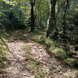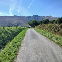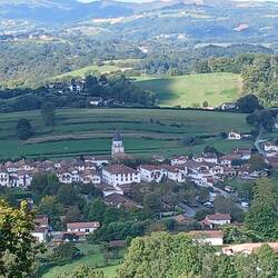 Nach einem kleinen Anstieg geht es runter nach Ainhoa, ein traditionel baskisches Dorf. Weiße Häuser mit roten Dächern und roten Fensterläden. Wir wollen bei einem kleinen Laden schauen, ob es Schonkost für mich gibt, aber dieser hat um kurz nach Mittag nicht geöffnet. Also weiter nach Sare, wo es einen größeren Supermarkt gibt. Auf dem Weg geht es durch eine kleine Hügellandschaft, wo der größte Höhenunterschied weniger als 100m beträgt. Eine Weile folgen wir einem Fluss und ich laufe etwas langsamer, damit Anne aufholen kann. In dem Moment, in dem Anne mich einholt, bekomme ich einen Schlag auf den Kopf und bin kurz verwirrt. Da hat mich eine Eichel erwischt und bei den großen Eichen bekommen die eine Fallgeschwindigkeit, bei der das schon für den Augenblick schmerzt.