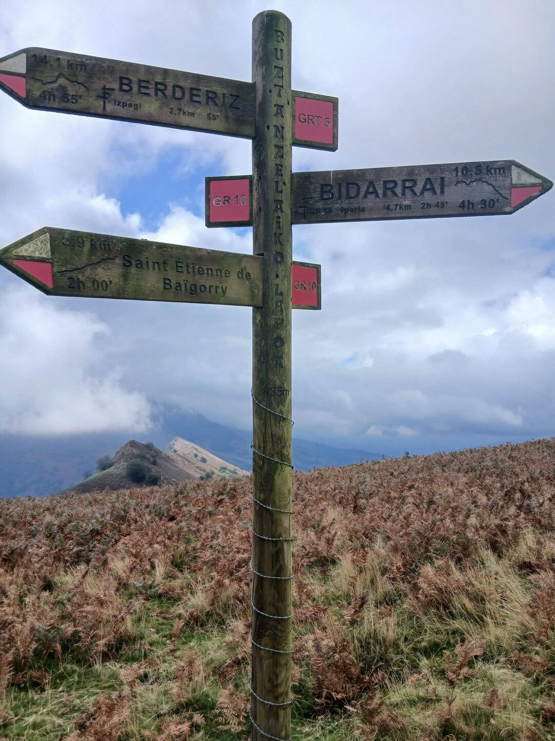 Nach einer schlaflosen Nacht mit einem grummelnden Magen geht es den Bergkamm entlang nach Iraty. Das letzte Stück an der Straße entlang, wo einige Autofahrende kaum Abremsen und Abstand halten. Der Ort selbst besteht aus wenigen Häusern, die vor allem für Tourismus ausgelegt sind. Etwas weiter kommen wir an den Heguichouria Pass, wo es einen kleinen Laden und einen Aufenthaltsraum gibt. Ein Ort der sehr schön mit der Landschaft gestaltet wurde und sehr menschenfreundlich wirkt. Im Aufenthaltsraum gibt es eine kleine Küche, Sofas, einen Kaffeevollautomat und natürlich auch Toiletten. Wir lassen unsere Sachen hier liegen und schauen uns den Laden an. Von Vielem ein bisschen, aber außer Tomaten und Kartoffeln kein frisches Obst oder Gemüse. Für mich gibt es sowieso nur Apfelmus und Joghurt mit Müsliriegel (in Krümelform). Für später noch grüne Erbsen und Karotten aus der Dose. Anne kauft für sich und hoffentlich morgen auch für mich regionalen Käse ein.