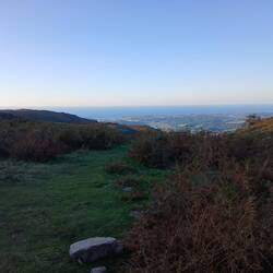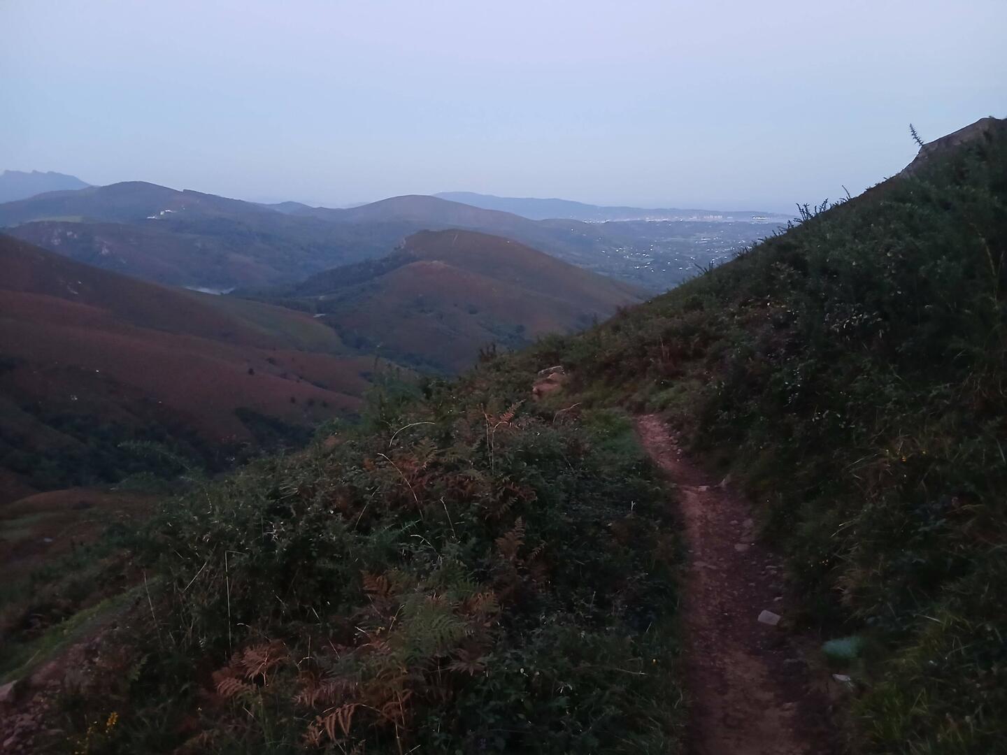 Mit einem wunderschönen Sonnenaufgang starten wir den letzten Tag auf dem Hexatrek. Zweimal ins Tal und wieder hoch, bis wir das erste Frühstück auf einem dicken Ast auf dem Boden genießen. 2km kommen wir nach Eltzaurdia, einem touristischen Grenzort, wo wir uns ein zweites Frühstück kaufen. Mit einem Zuckerschock steigen wir den nächsten Berg hoch und schauen auf die letzte größere Erhebung vor uns. Wir bereiten uns mental auf den letzten Anstieg und einen darauf folgenden steilen Abstieg vor. Doch wie ich vor dem Anstieg auf Anne warte, sehe ich ein Hinweisschild, dass der Wanderweg aufgrund von Bauarbeiten an den Stromleitungen umgeleitet ist. Anstatt hoch geht es an die spanische Grenze, die sich hier im Tal an einem Fluss orientiert. Ein kurzer steiler Anstieg in ein kleines Dorf und wir befinden uns wieder auf dem HT. Die letzten Kilometer führen uns über kleine Hügel nach Hendaye, wo die letzten zwei Kilometer flach am Wasser und durch die Stadt führen. Kurz vor Ende kaufen wir uns Snickers Eis, auf das ich mich schon lange freue.