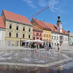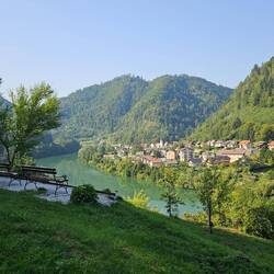 Danach geht's richtig los, dem Fluss Mur entlang südwärts Richtung slowenische Grenze. Steffi voll motiviert & voller Energie gibt das Tempo vor & wir kommen sehr zügig voran. Erste kurze Pause kurz vor der Grenze, danach müssen wir die ersten Steigungen bewältigen. Die sind heute zwar alle eher kurz, dafür umso steiler. Mehrfach zeigt unser Navi Steigungen von 12-15% an. Kombiniert mit der Hitze (laut Wetterbericht heute 32°C & Sonne pur) werden unsere Beine immer müder. In Maribor fahren wir kreuz & quer durch die Altstadt, gönnen uns ein feines Glace & danach noch Getränke & ein Pizzastück. Frisch gestärkt geht's weiter, nun dem Fluss Drava/Drau entlang. Wobei sich auch hier die Annahme, dass ein Flussradweg ziemlich flach ist, als Trugschluss herausstellt. Dauerndes Auf & Ab & um etwa 1730 kommen wir ziemlich platt aber zufrieden in Radlje an. Das angepeilte Natur-Bad bietet wie erhofft auch eine schöne Zeltwiese & so bleiben wir nach einem kurzen Einkauf hier. Im erfrischenden Wasser erholen wir unsere müden Beine, essen danach ne Kleinigkeit in der zugehörigen Bar/Restaurant & stellen erst mit dem letzten Tageslicht das Zelt auf.