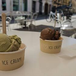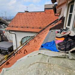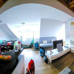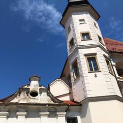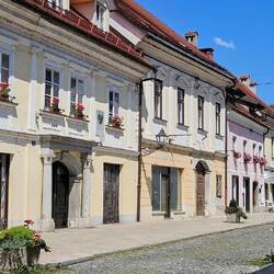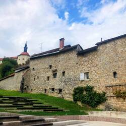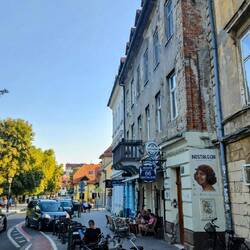 Als Kompensation zum fehlenden Regenschutz geben wir einfach bisschen mehr Gas. Mit etwa 19°C ist es auch warm genug, um mit nassen Kleidern nicht (zu stark) zu frieren. Als eine dunkle Wolkenwand in unsere Richtung zieht entscheiden wir, in Škofja Loka nochmals eine Bäckerei oder Café aufzusuchen. Die Suche danach dauert aber etwa 3 Minuten zu lange, so dass wir noch richtig heftig verschifft werden🌧️. Triefend nass erreichen wir ein Café, das Personal sehr freundlich & die Wasserlache unter unserem Tisch scheint sie nicht zu stören. 'Kava s smetano' (Kaffee mit Schlagrahm - manchmal auch eher Schlagrahm mit Kaffee) & sehr feine Tortenstücke entschädigen für die nassen Kleider. Wir entscheiden uns zum einzigen Mal in diesen Ferien gegen das Zelt & für ein Zimmer. Buchen online die 'Suite' im Kulturzentrum von Kranj.