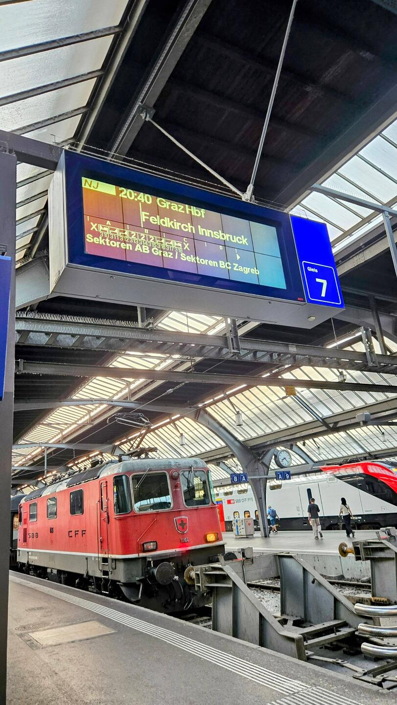 Um etwa 2025 stehen wir rechtzeitig am HB Zürich. Ein kleines Problem beim Veloverlad gehört wohl einfach dazu, dieses mal ist es ein Velo, welches offenbar jemand auf der Fahrt Richtung Zürich im Zug 'vergessen' hat 🤔. Blöderweise ist dieses mit einem Schloss an den Velohaken gekettet & gemäss Zugspersonal reicht die Zeit nicht mehr, die Polizei zu rufen um das Schloss gewaltsam zu öffnen. So werden halt 4 Velos (ein weiterer Reisender + wir zwei) auf 3 Plätze gequetscht, geht aber alles gut. Personen hat's dafür umso weniger im Nachtzug, wir sitzen zuerst nur zu dritt im 6er Abteil. Als wir dann entdecken, dass der Wagen hinter uns weitgehend leer ist, schnappen wir uns dort sogar ein 6er Abteil nur für uns alleine. Können somit also doch beide liegen & fühlen uns morgens um 0700 bei der Ankunft in Graz relativ gut erholt.