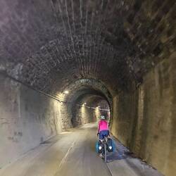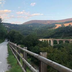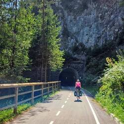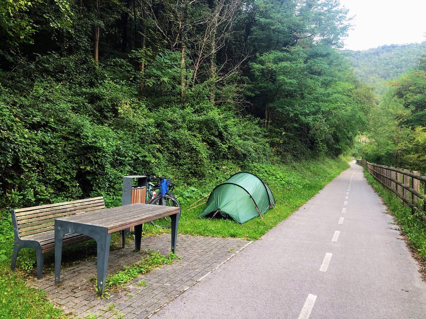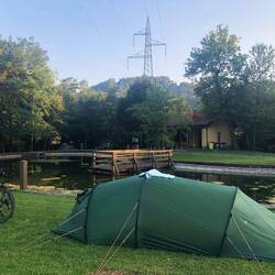 🗒️Erstaunlich, wie zahlreich die Züge sind, die nachts auf dieser Bahnstrecke nah an unserem Zelt vorbeidüsen. Markus wacht zwar jeweils kurz auf, schläft aber auch gleich wieder ein & fühlt sich morgens sehr gut erholt. Steffi's Schlaf ist während einer Bushnacht jeweils weniger tief & erholsam, zuviele Gedanken an (nicht vorhandene😉) Gefahren schwirren durch den Kopf. Um 0605 werden wir vom Wecker geweckt: Wildzelten ist in Slowenien nicht offiziell erlaubt & so wollen wir alle Spuren beseitigt haben, bevor die Velofahrenden ihren Tag starten & unser Nachtlager passieren.