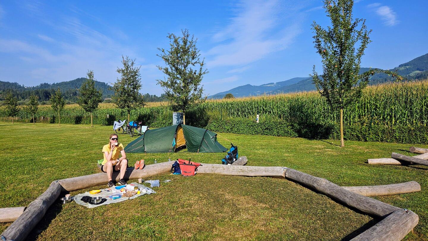 🗒️Heute ist unser letzter Velotag und wir sind unserem Ziel Villach schon ganz nah. Also lassen wir es gemütlich angehen und frühstücken in der Sonne vor unserem Zelt. Sitzen am Boden, Sitzbänke gibt es nicht. Aber sind ja auch mal wieder fast alle mit ganz viel Equipment und ihren großen Campern da. So viel Plastik. Nicht unsere Welt, mögen es einfacher, mehr Natur und weniger Material. Planen schnell eine kleine Seenrunde, packen ein und sind bereit. Markus diskutiert noch mit dem Campingwart. Haben gestern online die Preise auf der Webseite gecheckt und sind auf einen niedrigen Preis gekommen. Zudem wurde unsere ID dankend abgelehnt, denke unser Geld wurde schwarz eingesteckt. Die Kurtaxe nicht gemeldet, wie denn ohne Namen? Und dann auch noch die Strompauschale verrechnet, aber ist doch ein Unterschied ob der Camper angeschlossen wird oder wir kurz unser Handy laden. Aber wenig Einsicht beim Campingwart, der ist nur gefrustet, schade.