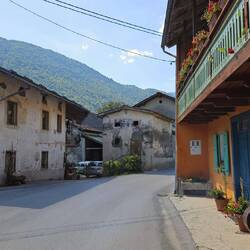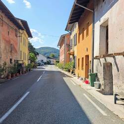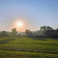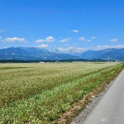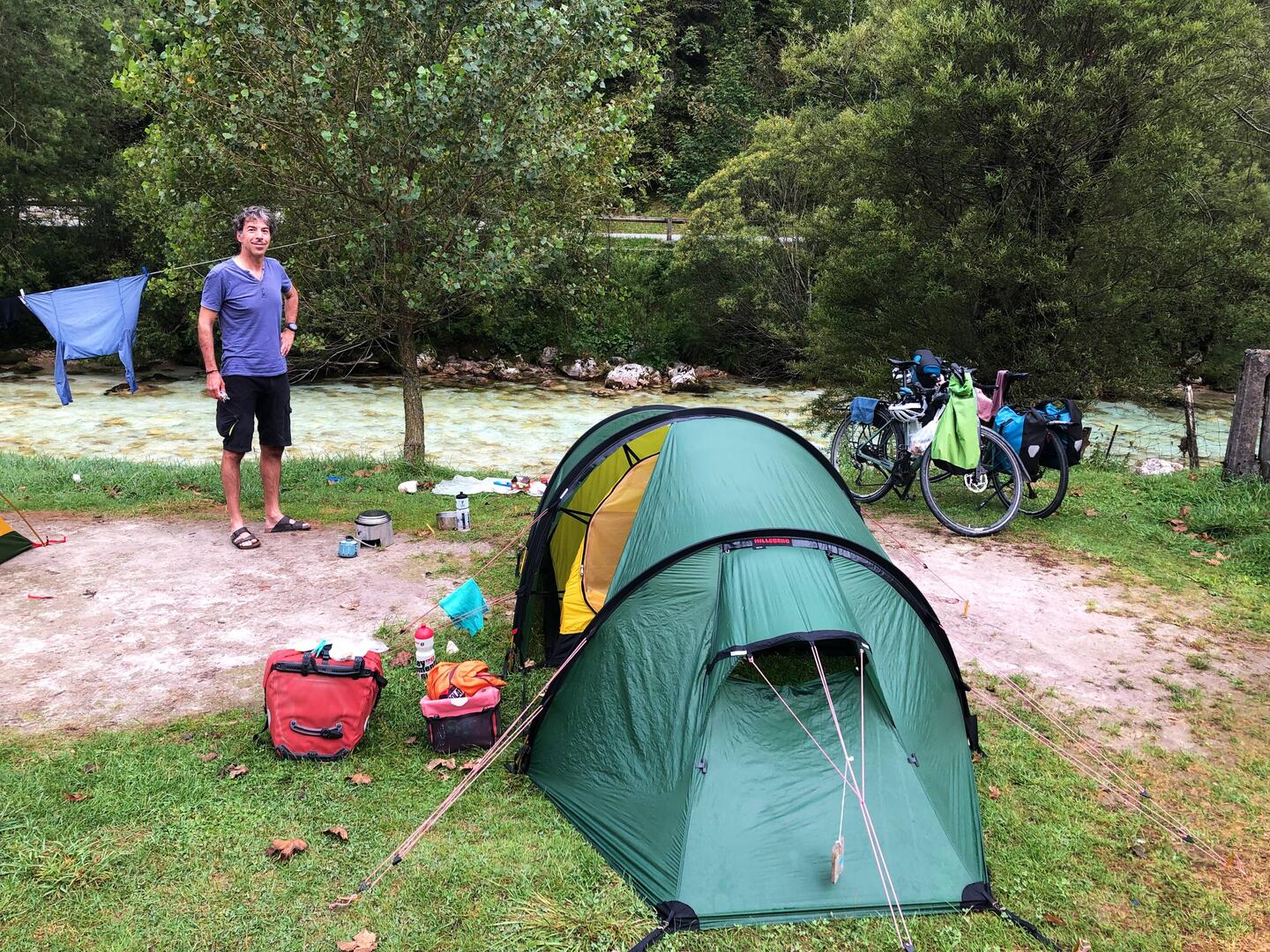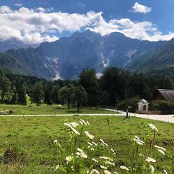 Der Himmel ist nach paar Wolken am Morgen inzwischen wieder strahlend blau & die Sonne brennt, worunter Steffi heute leidet - nicht so ihr Tag☹️. In Bovec gibt's eine Trink- & tlw. Glacepause & wir beschliessen definitiv, den Vršičpass nicht mehr heute unter die Räder zu nehmen, zu zahlreich waren die Höhenmeter bereits bis hierher. Ein paar Kilometer später finden wir einen hübschen Camping auf einem Bauernhof. An der Reception heisst es allerdings, sie seien bereits ausgebucht! Dank dem Velobonus dürfen wir dann aber trotzdem bleiben, Glück gehabt! (War bisher in Slowenien, ausser in Ljubljana, noch nie auch nur annähernd ein Problem.) Sehr schöner Camping, eine grosse Wiese nur für Zelte, Autos müssen draussen bleiben. Ist viel schöner so, als wenn all die Blechkisten sich auch noch auf die Wiese quetschen!