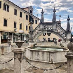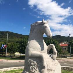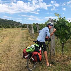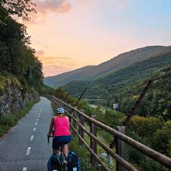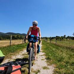 🗒️Heute geht es ohne Frühstück los. Wir fahren 10 Kilometer direkt am Meer entlang und suchen uns ein Café in Koper. Bestellen feinen Café und lecker Toast mit Ei und Avocado bzw. Ei und Sauce Hollandaise (Egg Benedict). Wir blicken direkt aufs Meer und den Hafen von Koper. Ein großes Containerschiff wird von 3 Schleppern aufs Meer hinaus eskortiert, mehrere Schiffe sind bereits am warten. Nett zu beobachten. Im Anschluss drehen wir eine kurze Runde durch die Stadt, vorbei am Tito Platz mit dem Prätorenpalast und am Da Ponte Brunnen vorbei. Der venezianische Einfluss ist sichtbar. Dann gehts los. Nochmal durch die Vorstadt von Triest (Italien), durch die Weinberge - wir naschen einige feine Trauben - und dann auf eine alte Bahnstrecke, die zu einem super Veloweg umfunktioniert wurde. Immer weiter hoch in die Berge. Zum Glück ist es heute nicht so heiss und die Steigung ganz o.k. Der Weg ist geschottert. Und noch weiter hoch auf einer kleinen Straße im Wald, so langsam wird es es anstrengend. Bei Basovizza haben wir die Höhe geschafft. Nochmal Schotter, diesmal recht grob und in Sežana (wieder Slowenien) stürmen wir den Supermarkt. Picknicken direkt auf dem Parkplatz, sind hungrig und durstig. Auch die Slowenen haben eine sehr feine Cremeschnitte. Mit frischer Energie geht es über schöne kleine verkehrsarme Straßen hoch und runter und kurvig weiter. Durch die Weinberge und kleine Dörfer. Macht Spaß. Kommen an einer steinernen Pferdestatue vorbei, laut Übersetzung ein bekifftes steinernes Pferd ('stoned horse'). Hier aus Lipica stammen die Lipizzaner Pferde. Eine kurze Rast an einem Dorfplatz und dann nochmal über die Grenze nach Italien. Die italienische Stadt Gorizia/Görz geht dann direkt in die slowenische Stadt Nova Gorica über. Hier sieht man einen Unterschied bei den Häusern, auf slowenischer Seite wirkt es sowjetischer und einfacher. Wir kaufen kurz ein und erreichen dann den Fluss Soča. Hier ein perfekter Radweg. An einem Brunnen erfrischen wir uns kurz und füllen die Wasserflaschen. Erblicken einen schönen Rastplatz und beschließen, hier zu campen. Schnell ist das Zelt aufgestellt, es dämmert bereits. Markus kocht noch und im roten Licht der Stirnlampe essen wir. Beobachten den Sternenhimmel und ab in den Schlafsack.Læs mere