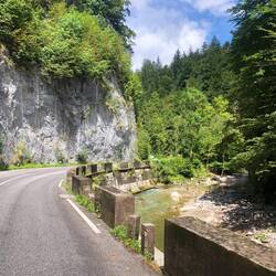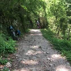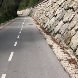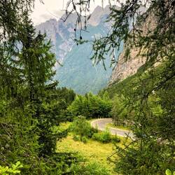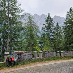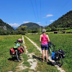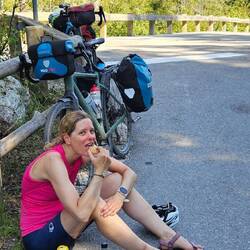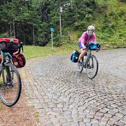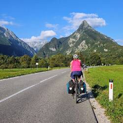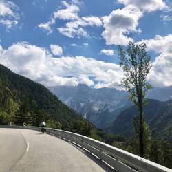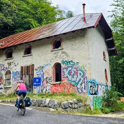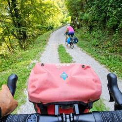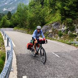 Danach starten wir dann 'richtig' zur heutigen Tour. Die Strecke führt taleinwärts entlang dem Fluss Soča, wir stellen uns daher auf ca. 80km 'sanftes Einrollen' mit konstanter, moderater Steigung ein, bevor dann für etwa 15km der harte Anstieg auf den Vršičpass folgt. Denkste! Die Höhenmeter sind viel zahlreicher als erwartet & machen heute v.a. Steffi zu schaffen. Insbesondere zu Beginn ähnelt die Strecke zudem mehrmals eher einem Mountainbike-Trail als einer Route fürs Tourenvelo. Mehrfach bleibt uns wegen der sehr steilen Streckenführung oder sehr grobem Untergrund nichts anderes übrig als die Velos kurze Abschnitte zu schieben. Nach 25km in Most na Soči haben wir Brutto schon 600 Höhenmeter geschafft, netto sind wir aber gerade mal etwa 80m höher als am frühen Morgen😳. Uff, das kann ja noch hart werden!