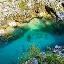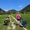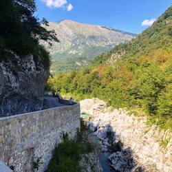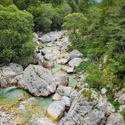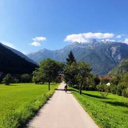 Die Streckenführung ist, abgesehen von den etwas gar vielen Höhenmetern, sehr schön: Während etwa 50km sind Strasse & Veloweg immer voneinander getrennt & verlaufen meistens auf unterschiedlichen Talseiten, getrennt durch die Soča. D.h. mal verläuft die Autostrasse rechts, Veloweg links der Soča & nach einigen Kilometern wechseln beide die Talseite & dann heissts Autos links & Velos rechts. Abgesehen von den ersten Kilometern mit Mountainbike-Feeling, ist der Veloweg sehr gut ausgebaut & super schön zu fahren. Ebenso ist die Umgebung spektakulär. Stellenweise erinnert es ans Verzascatal (Tessin/CH), das Tal eng, die Soča tief eingefressen ins Karstgestein, dann öffnet sich das Tal wieder, bildet eine kleine Hochebene & die Soča fliesst durch ein breites Flussbett aus rund geschliffenen weissen Steinen. Daneben die Berge, die immer höher werden, je tiefer wir uns Tal eindringen. Eindrückliche Landschaft! Die Gegend hier gilt auch als Outdoor-Mekka, zahlreiche Anbieter laden ein zu Canyoning, Kanufahren, Riverrafting. Ebenso sieht man überall Wanderer.