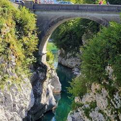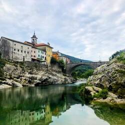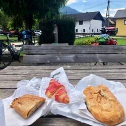 Nach nur 11km erreichen wir den Ort 'Kanal ob Soči', wo auch ein schöner Zugang zur Soča besteht. Wir nutzen die Gelegenheit & springen ins frische Wasser - Morgenbad🛀! Anschliessend setzen wir uns ins nahe Cafe & frühstücken bei Latte Macchiato & Schoggi- bzw. Pistazien-Croissants gleich zum zweiten Mal.