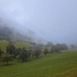 🗒️In der Nacht prasselt heftiger Regen auf unser Zelt, abgesehen von kurzem Aufwachen hat uns dies aber nicht gestört - was der Tag bringt, sehen wir dann, wenn es so weit ist. Morgens regnet es zwar nicht mehr, aber die Wiese ist nass, weshalb wir das einzige Mal auf dieser Reise im Zelt drinnen frühstücken. Dann aber schnell alles zusammenräumen & das fast trockene Zelt einpacken - es fallen bereits die nächsten Regentropfen. Als wir auch noch Zähne geputzt haben & startklar sind, öffnet der Himmel erneut seine Tore & es giesst. So macht es keinen Sinn zu starten & wir genehmigen uns im Camping-Restaurant einen Kaffee. 15 Minuten später starten wir dann bei nassen Strassen, aber von oben ist's trocken.
