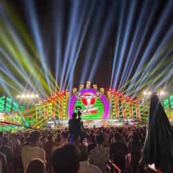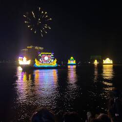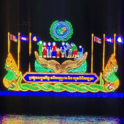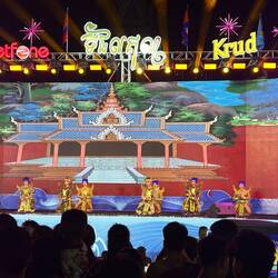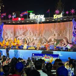 After a mid-evening break, they start a fireworks show for 2 hours and we walk along the river where light up boats cruise up and down. Venturing back to the festival grounds, we see some water wrestling and beautiful traditional Cambodia dances executed by a dance studio and live band.