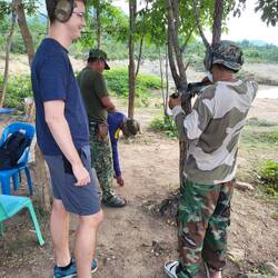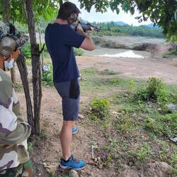 We get to the base and drive up to an area with big holes, army men, and a line of guns. Visal provided water and beer. Hanging out with the Cambodian Army guys was cool; they were all dressed in their camo but wore flip flops, which is very southeast Asian. It ends up we couldn’t shoot the Dragunov because they needed it for real army training that day lol