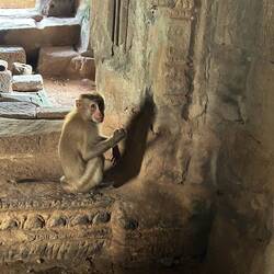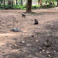 Third was Bayon Temple. As we arrived, we noticed a large group of monkeys that didn't seem afraid of people. We ran over to the monkeys and got some good pictures. Our relaxed guard around them would come back and bite us in the ass later. We walked throughout Bayon Temple and appreciated the Buddhas and monkeys in the temple. When we left, we decided to get some drinks before heading to Angkor Wat. Mary had finished her iced coffee and was holding the plastic cup when one of the monkeys jumped on her, swatting the cup out of her hand. We quickly realized why they were so friendly as we watched him drink the sugary coffee off the ground.