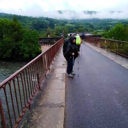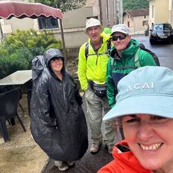We went slip sliding away trying our best not to end up on our backsides. Simon had to fight bushes to help us bypass huge lakes that had formed on the path. 7 hours later we made it into Estaing, across the pretty bridge into the town. We were filthy, smelly but happy to have made it to sit and have a beer and reflect.