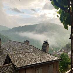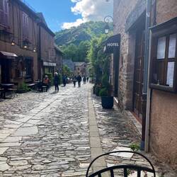 Yesterday we were up early to meet Helen and Andy off the morning bus from Rodez. The weather was mixed with intermittent heavy showers and sunshine. We visited the local bakery so we could all eat at lunchtime. The only grocery store was on the local campsite so we trotted through the cobblestone streets to get the necessities- toilet rolls and bananas 😂.