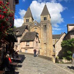 Conques is a very old hobbledy hoy medieval village. When we got into our ancient house we found Hansel and Gretel 😂 Simon’s sense of humour! It all looks like it’s out of a fairy tale. As usual we were starving and have discovered that cafe/snack bars do a dish called ‘galettes’ which is the French version of a Staffordshire oatcake with savoury fillings 🙌 so we haven’t had to wait until 7 to eat.