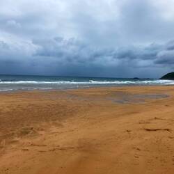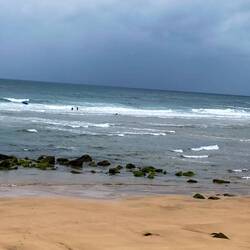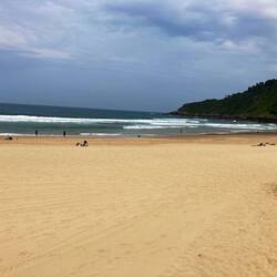 After a steep descent we came to a long beach full of surfers, volleyball players and sun worshipers, despite the lack of sun!
