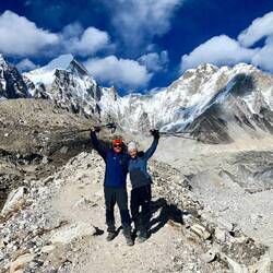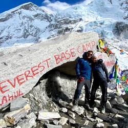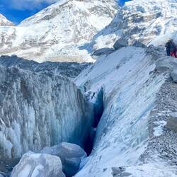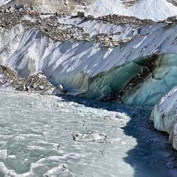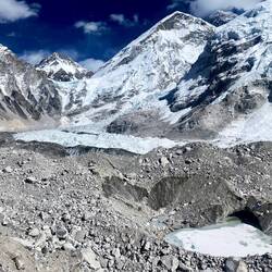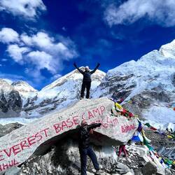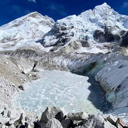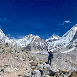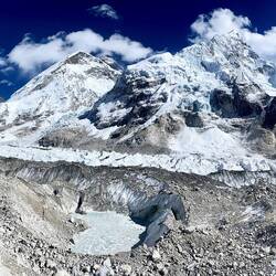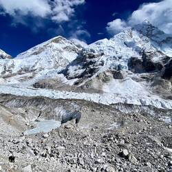Die 3 km lange Wanderung ist ohne Gepäck deutlich angenehmer, aber jeder Schritt führt dennoch zu einer Schnappatmung. Wir laufen wieder in der ganzen Horde immer am Khumbu Gletscher entlang und hoffen nach jeder Kurve, endlich am Ziel zu sein. Und dann ist es auch endlich so weit. Vor uns glitzert ein großer vereister Gletschersee und dahinter können wir schon von hier oben den berühmten Stein des Base Camps (und all die Touristen) sehen. Also nehmen wir noch einmal die Beine in die Hand, vorbei an einer tiefen Gletscherspalte 😳 und haben es dann endlich geschafft 🥳🥳🥳🥳. Was für ein tolles Gefühl. Der Gipfel des Mount Everest zeigt sich uns immer wieder, die kleinen Wolken ziehen brav vorbei und wir stehen also nun hier, wo für die verrückten Bergsteiger das Abenteuer erst anfängt. Da die Saison der Bergsteiger erst im Frühjahr ist, sehen wir jetzt die zu dieser Zeit hier aufgebaute Zeltstadt nicht. Das macht aber gar nichts, der Ort ist auch so irgendwie magisch, hat sich hier doch schon so viel Erfolg und Tragik abgespielt.