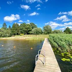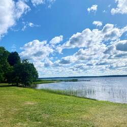 Nach dem schönen Platz in Aizputes fahren wir weiter. Ziel ist nun der See Usamas. Der Weg führt uns an der Stadt Kuldiga vorbei, die einen kurzen Besuch wert ist. Hier befindet sich die Backsteinbrücke über die Venta. Die Straßenbrücke ist mit 164 Metern die längste mit dem Auto befahrbare Backsteinbrücke Europas. Sie wurde von 1873 bis 1874 erbaut. Die Stromschnellen (manche nennen sie auch einen Wasserfall 😅) der Venta (deutsch Windau) sind mit 270 bis 275 Metern die breitesten Europas. Die Gegend hier ist wirklich sehr schön, viele Leute erfrischen sich in der Venta und schlendern über die Brücke. Uns ist es zwar immer noch etwas zu frisch, ins Wasser zu hüpfen, aber einen Spaziergang gönnen wir uns durch die hübsche Landschaft natürlich auch, bevor es weiter zum See Umas geht. Laut Internet soll man hier ganz besonders fischen können und es gibt unzählige Campingplätze, sollte der Stellplatz nicht so toll sein.