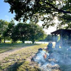 Wir steuern schließlich die Stadt Aizputes und den dortigen See an. Hier finden wir einen wunderschönen Parkplatz mit Grünanlage, Grill- und Badestelle vor und freuen uns um so mehr, dass außer uns nur ein paar Radfahrer vorbeikommen. Schnell ist entschieden, dass wir hier bleiben, Manu wirft ein paar mal seine Angel ins Wasser, während ich schon einmal alles für unser Abendessen am Lagerfeuer herrichte. Sogar Brennholz liegt ordentlich gestapelt für uns bereit 😍. Und so haben wir hier einen schönen einsamen Abend, mit Musik, ein paar kühlen Bier und uns. So lässt es sich leben und wir genießen die Zeit sehr.Read more
