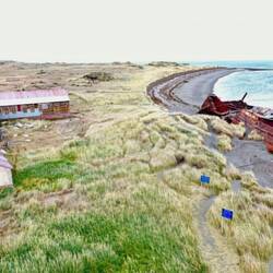 Unser schicker Mazda mit Allradantrieb wird uns vor die Haustür geliefert und wir können nun los in Richtung Feuerland. Auf dem Weg zur Fähre in Punta Delgada kommen wir durch ein auf den ersten Blick normale verlassenes Örtchen, an deren Strand ein ziemlich großes Schiffswrack steht. Die Amadeo war ein Dampfschiff, das 1884 in Liverpool gebaut wurde und 1932 bei San Gregorio auf Grund lief. Hier können wir zum ersten Mal die Drohne fliegen lassen und testen.