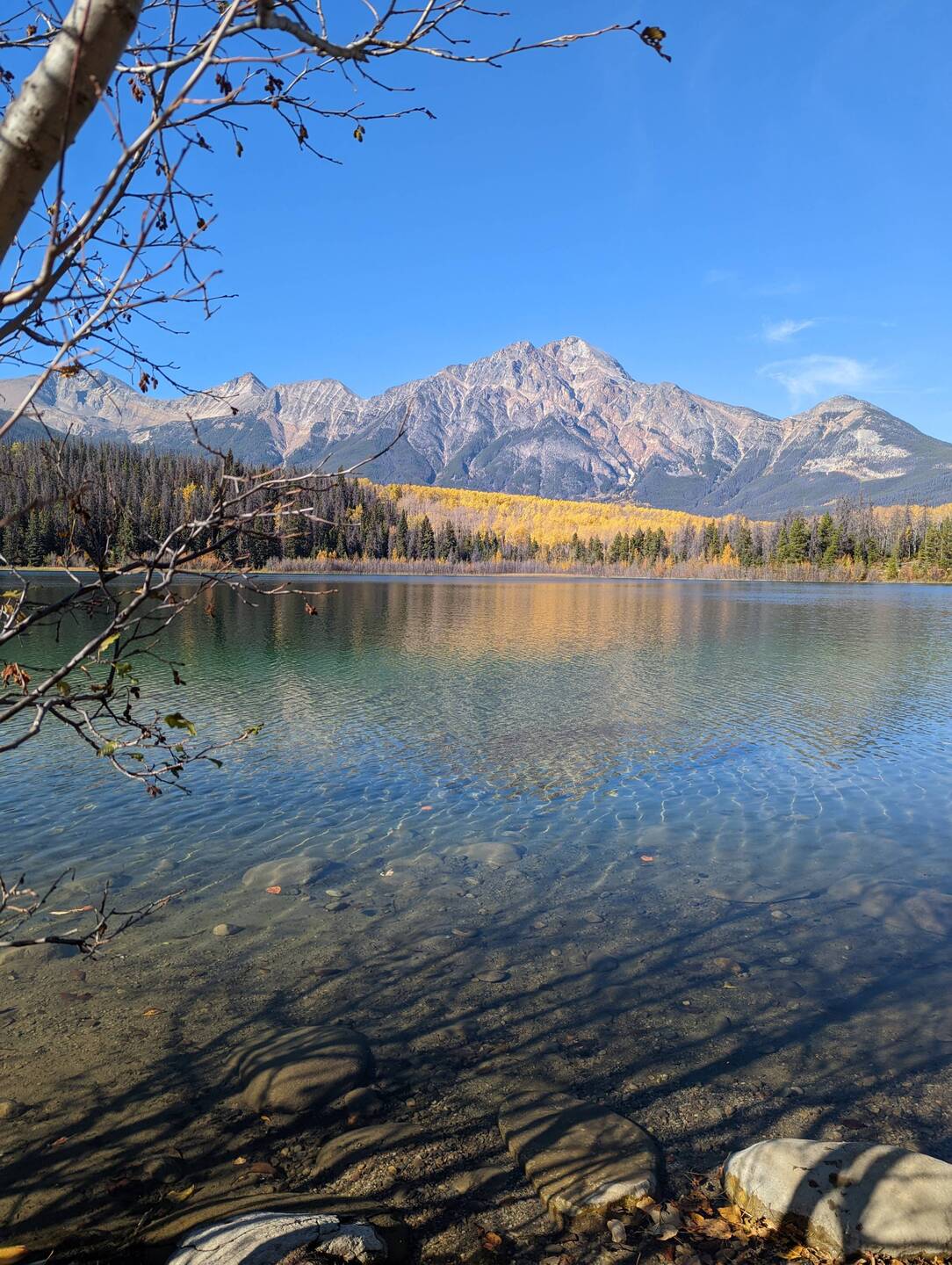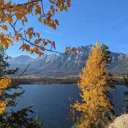 We arrived in Jasper shortly after noon to check out the visitor center and inform us on possible hikes for the remainder of the day. There were some interesting options but they involved driving for an hour. That's why we went to the Pyramid Lake, just a little bit out of town offering a huge network of hiking trails. Right after the lake the name giving Pyramid mountains tower over the lake.