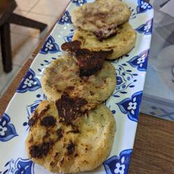Right after the border we changed the remaining Quetzales into US Dollars, the official currency with the second currency being Bitcoin 🪙 It was just a short drive of about half an hour to Concepción de Ataco, the first of several towns making up the Ruta de las Flores. We stopped in the city center and walked around a bit until we found a good spot to try El Salvador's national dish: Pupusas! Freshly baked maíz (and rice dough) filled with anything your heart is craving for, like cheese, frijolitos, jalapeños. I've tried the Pupusa loca, filled with everything that's possible and about three times the size of a regular one!! 😅