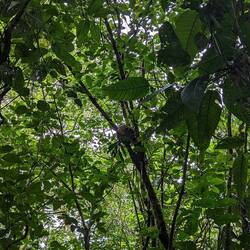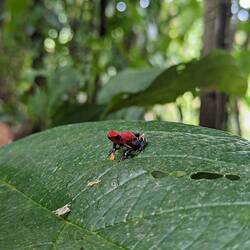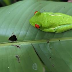 We had opened the doors at night again and I got woken up by some light rain on my face at 6 am. It was a nice, refreshing breeze and perfect temperature. Soon afterwards the screams of the howler monkeys and several bird species joined in on the orchestra. Even though it might sounds loud and annoying, it was a beautiful way to wake up! Julia encountered a bat in the bathroom while I had a visit from three large birds. We made some coffee and around 07:30 the people from the tour started coming in. Each one greeted us with a handshake and the general feeling was rather like friends than work colleagues. Our guide, Fernando, then took us on the trail into the rainforest... Just after 5 minutes he showed us a sloth 🦥😍 in quite the distance sleeping comfortably in its tree. He was very knowledgeable and told us a lot about the flora, fauna and even a bit of history. He showed us all the sloths in the area, three different species of frogs (one being extremely poisonous), a bat, a basilisk and many plant species. Overall we spent two hours on the perfectly maintained trail watching the wildlife 😍 An amazing experience so close by nature. We've had a coffee at the camp and said goodbye to the people who we had grown fond of since yesterday evening.